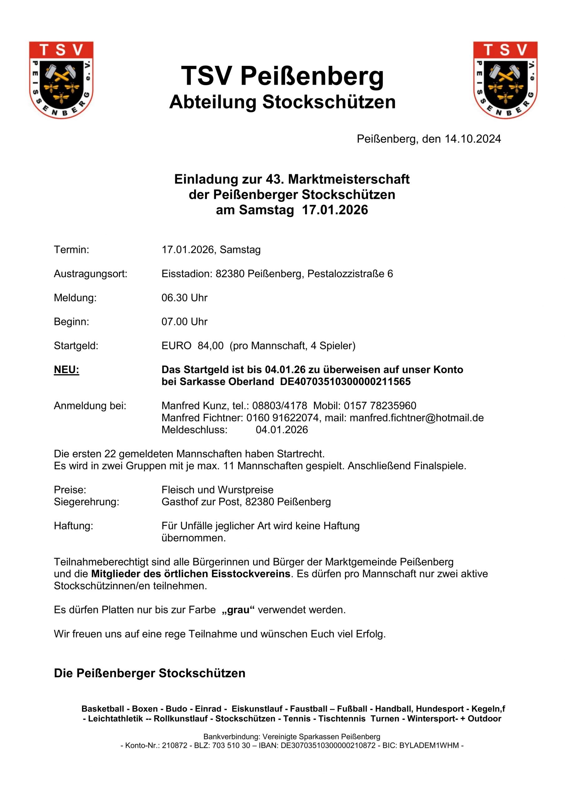 11.01.2025, Marktmeisterschaft in der Eissporthalle Voller Erfolg bei der 42. Marktmeisterschaft der Peißenberger Stockschützen im Eisstadion Peißenberg Großes Lob an alle Teilnehmer. Vollzählig und pünktlich waren alle 20 gemeldeten Teams um 07.00 Uhr am Start Das […]